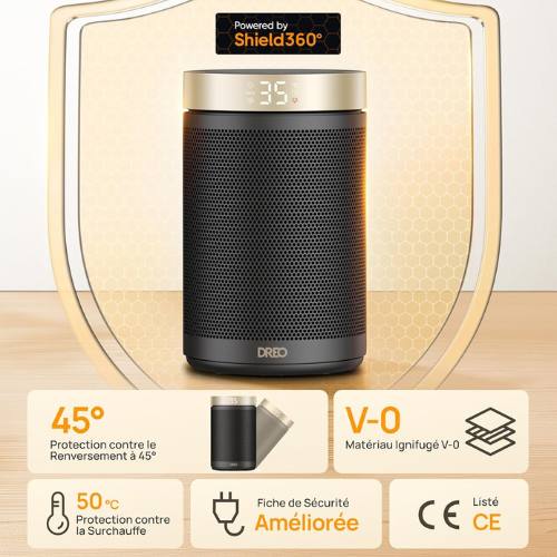 Il dispose d’une protection contre la surchauffe, d’un arrêt automatique en cas de basculement, et de dispositifs internes garantissant une utilisation sûre et durable.