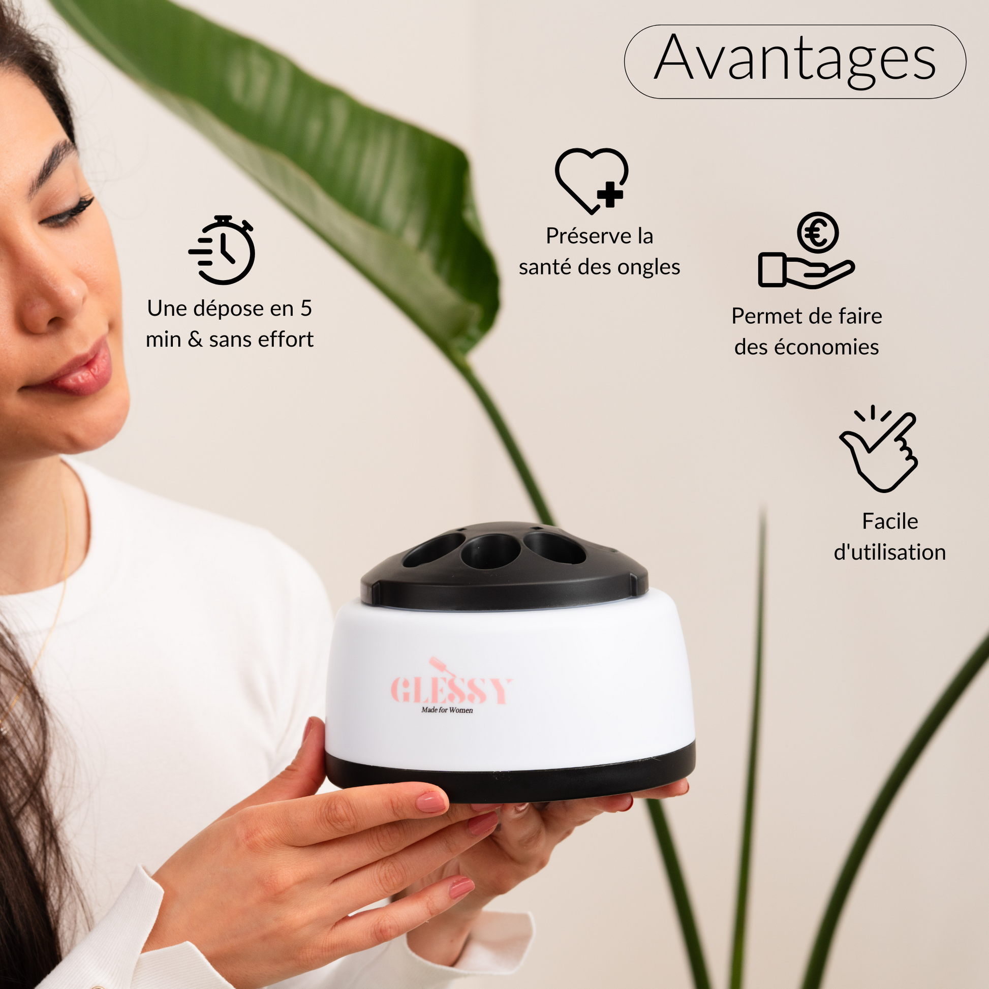 Grâce à son système fermé, le Glessy Pro minimise l’exposition prolongée aux solvants et offre un retrait plus contrôlé et sécurisé.