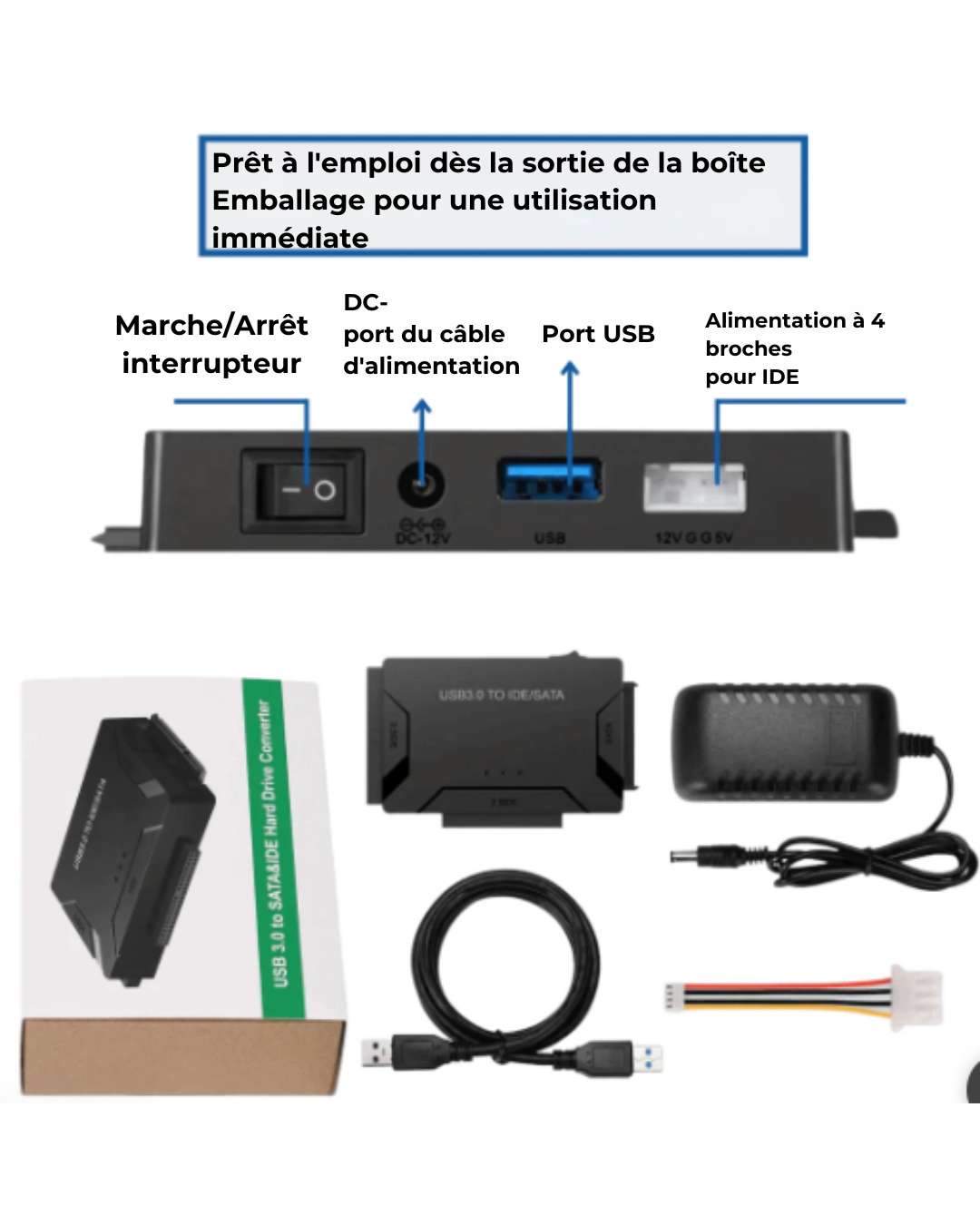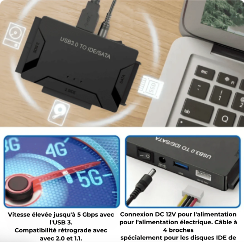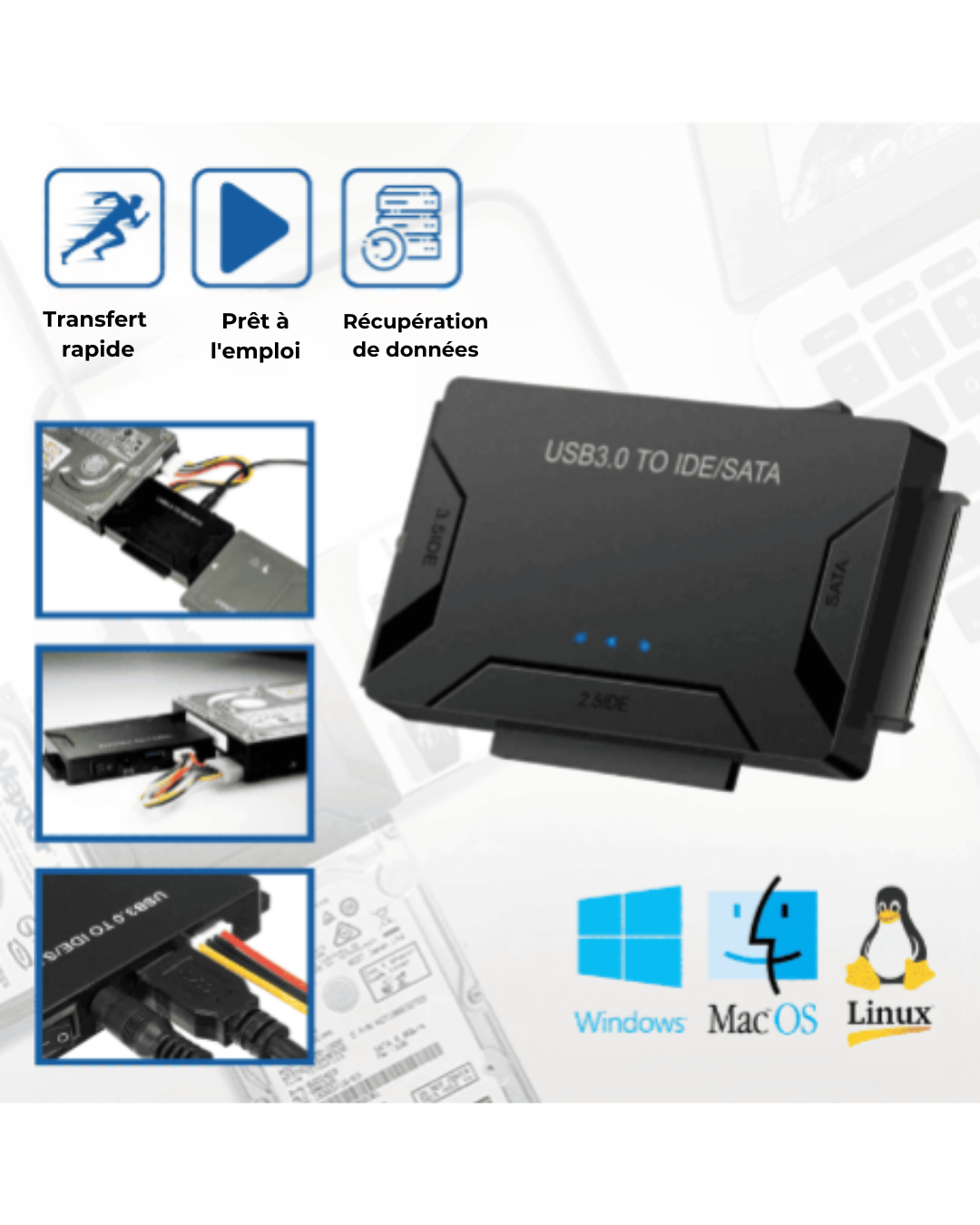 • Disques durs pris en charge : SATA & IDE (2,5" & 3,5"), jusqu'à 6 To