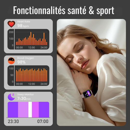 Elle propose un suivi continu de la fréquence cardiaque, de la saturation en oxygène (SpO₂), un suivi du sommeil, ainsi que plus de 100 modes sportifs pour couvrir la plupart des activités physiques.